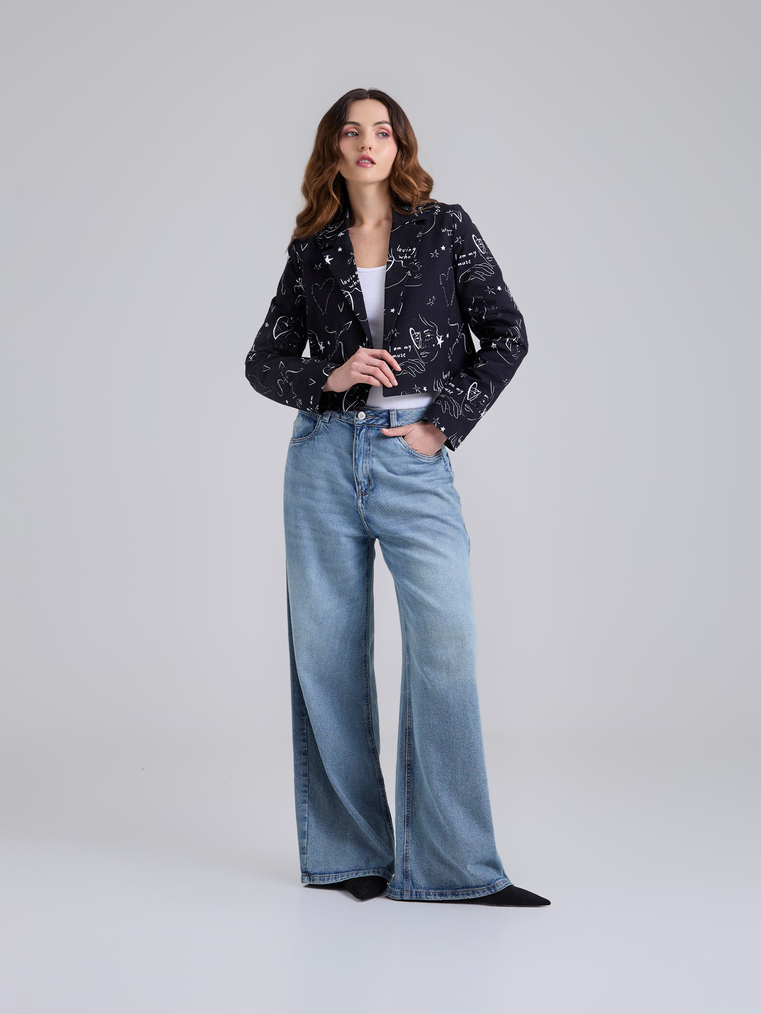 Blazer corto negro estampado, con cuello y solapa clásica y manga larga. Cierre frontal con botón.