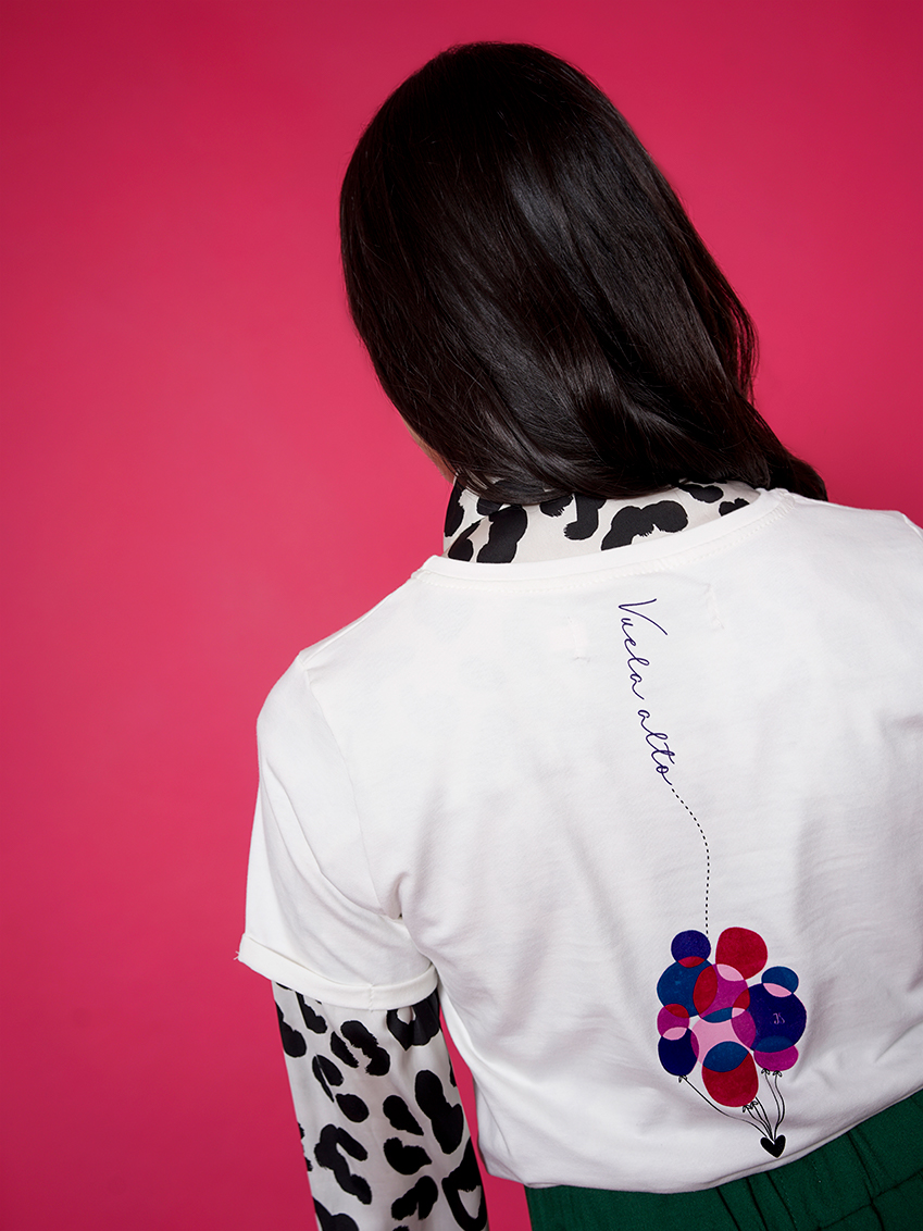 Camiseta color marfil de cuello redondo y manga corta, estampada en el frente con la frase «aquí todo es bonito» y en la espalda con un dibujo de globos con la frase «Vuela alto». Material: 97% algodón, 3% spandex. La modelo mide 1.67 mts y está usando talla XS. Tiempo de envío: entre 3 y 5 días hábiles. Envío gratis por compras superiores a 150.000 COP
