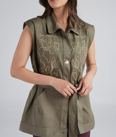Chaleco Oversize color blanco, con cuello tipo camisa, bolsillos en el frente y cinturón.