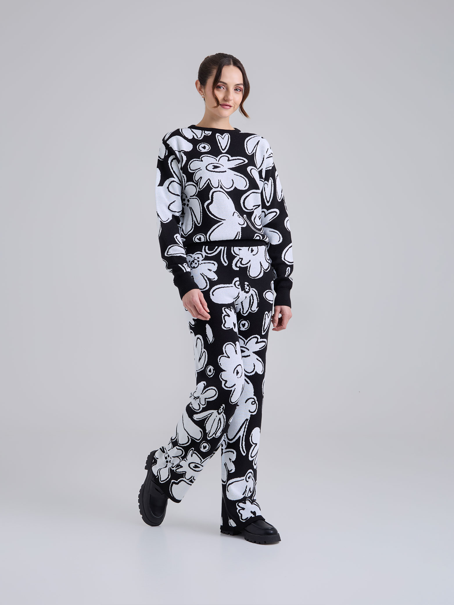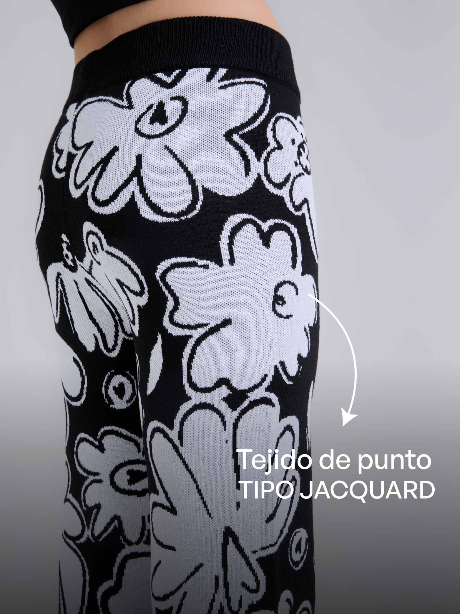Pantalón tejido en un punto suave y cómodo, con cintura elástica y bota recta. Presenta flores y corazones ilustrados en contraste de la colección Florecer en el Camino. Base negra con ilustraciones en tono crudo.